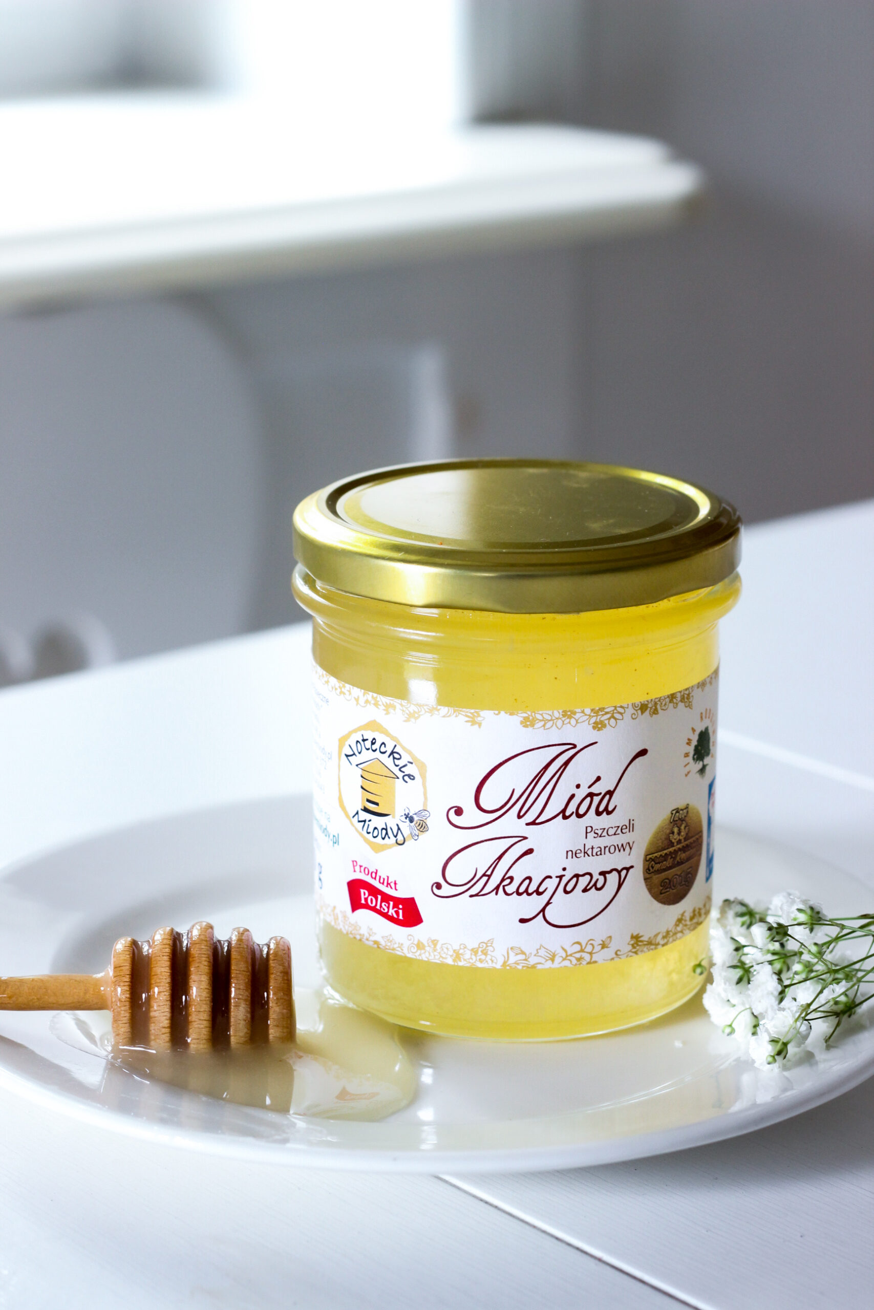- Miód nektarowy akacjowy o jasnej, niemal przezroczystej barwie