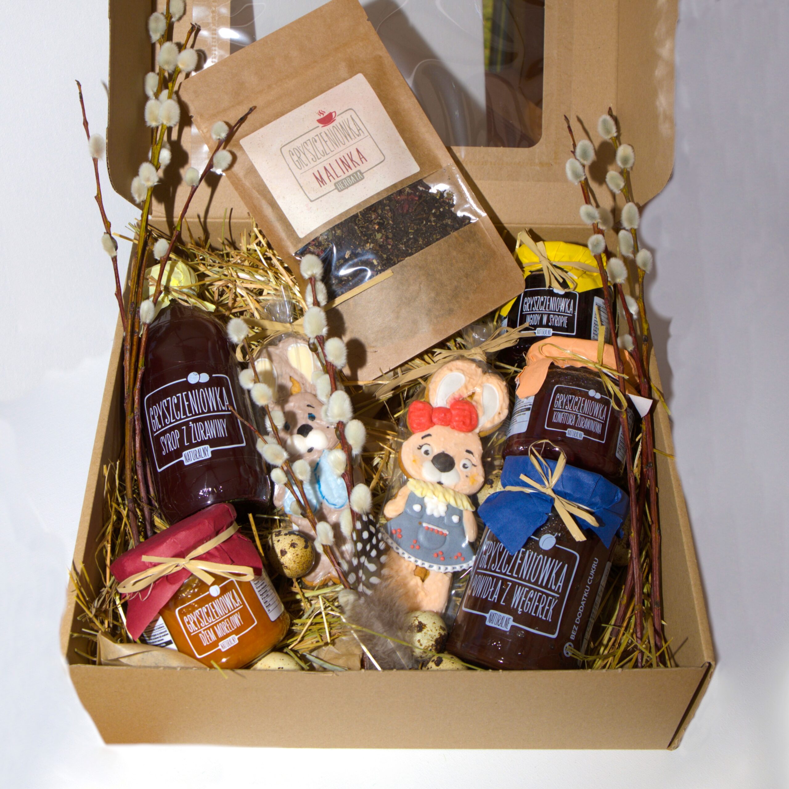 W jego skład wchodzi słoneczny dżem morelowy, intensywny syrop z żurawiny oraz klasyczna konfitura żurawinowa o lekko wytrawnym charakterze. Całość dopełniają tradycyjne powidła z węgierek oraz jagody w syropie o głębokim, leśnym aromacie. W zestawie znajduje się również aromatyczna herbata Malinka, idealna na spokojne, świąteczne chwile, oraz dwa pierniki w kształcie króliczków, które wprowadzają wielkanocny klimat i odrobinę słodyczy.